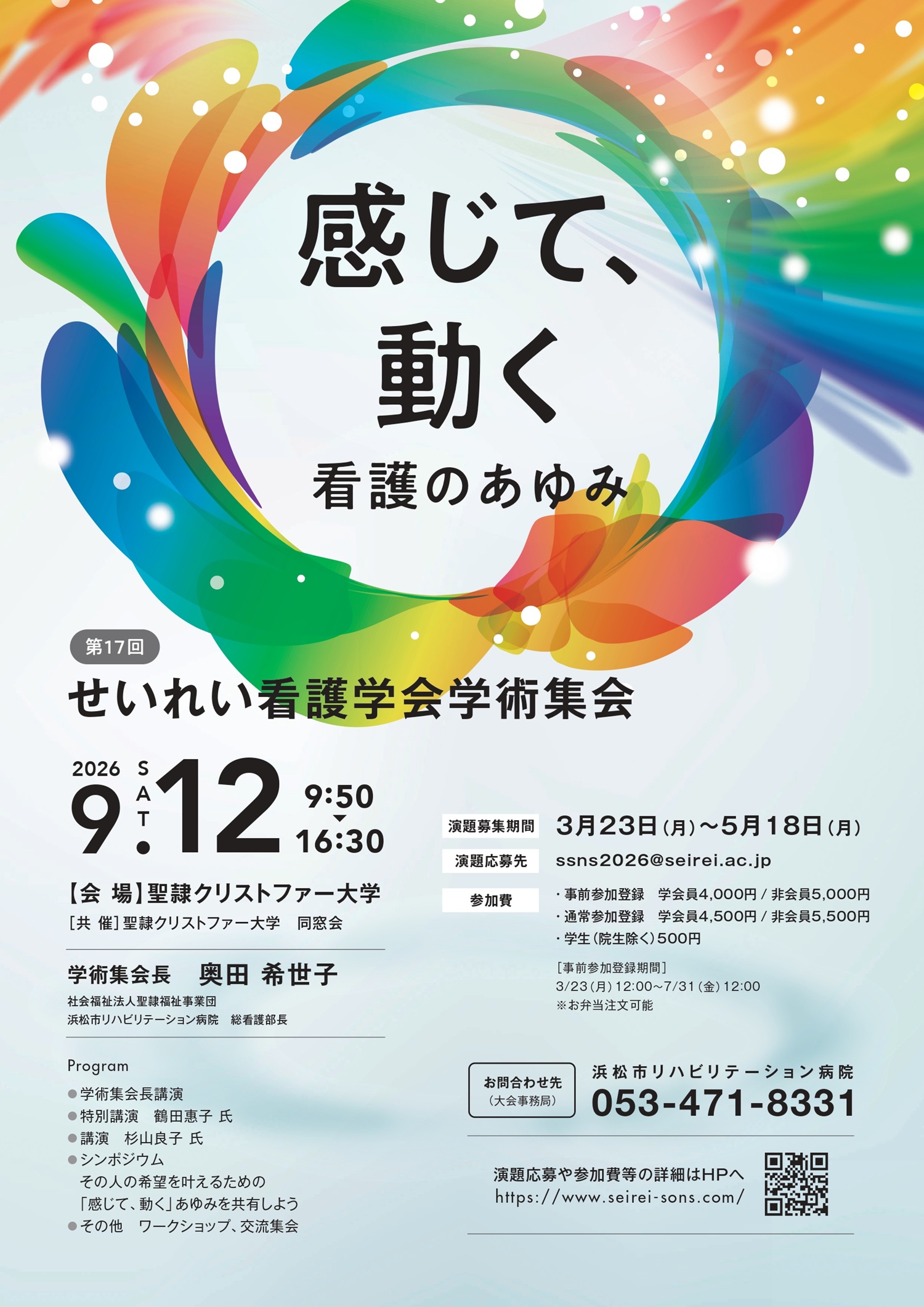 私たちは今、DX(デジタルトランスフォーメーション)をはじめ、医療技術の革新、社会構造の変化、人々の価値観の多様化など、劇的な変化の真っ只中にいます。このような中で、看護の役割も進化していくことが不可欠です。 本学術集会では、看護を必要とする人々のために「感じて・動く」看護のあゆみを共有します。最新の技術を取り入れながらも、手と心で触れるケアの温かさを大切にする未来の看護について考え、学びを深め、交流ができる学会となることを願っております。多くの方のご参加を、心よりお待ちしております。